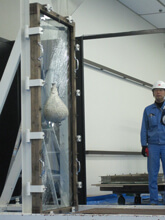 45kg の重りを振り子式に振り下ろしてガラス面に衝撃を加える試験。